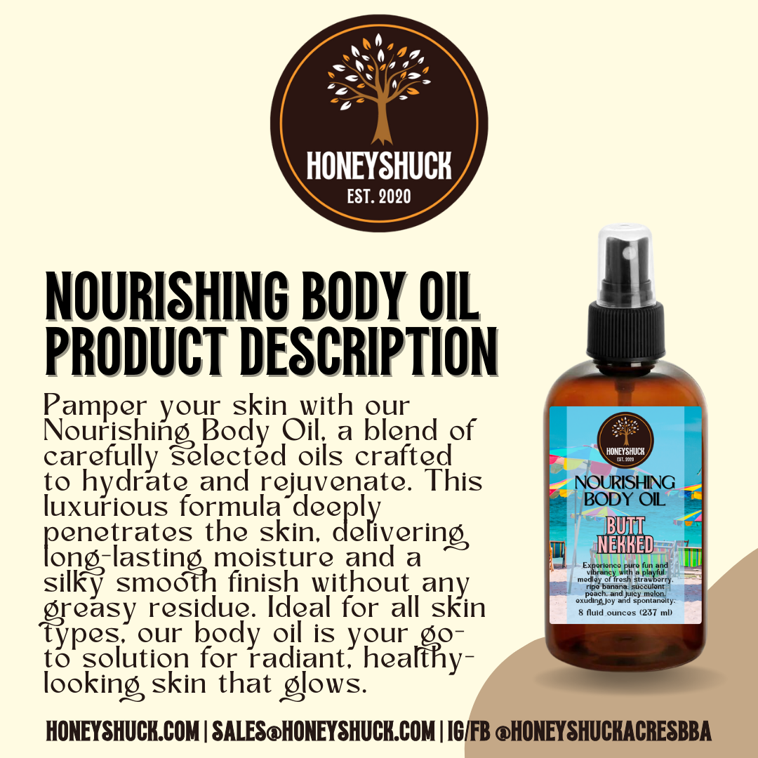 Pamper your skin with our Nourishing Body Oil, a blend of carefully selected oils crafted to hydrate and rejuvenate. This luxurious formula deeply penetrates the skin, delivering long-lasting moisture and a silky smooth finish without any greasy residue. Ideal for all skin types, our body oil is your go-to solution for radiant, healthy-looking skin that glows.