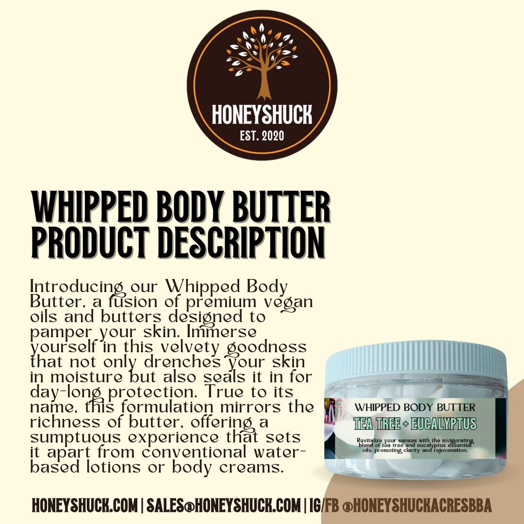 Introducing our Whipped Body Butter, a fusion of premium vegan oils and butters designed to pamper your skin. Immerse yourself in this velvety goodness that not only drenches your skin in moisture but also seals it in for day-long protection. True to its name, this formulation mirrors the richness of butter, offering a sumptuous experience that sets it apart from conventional water-based lotions or body creams.