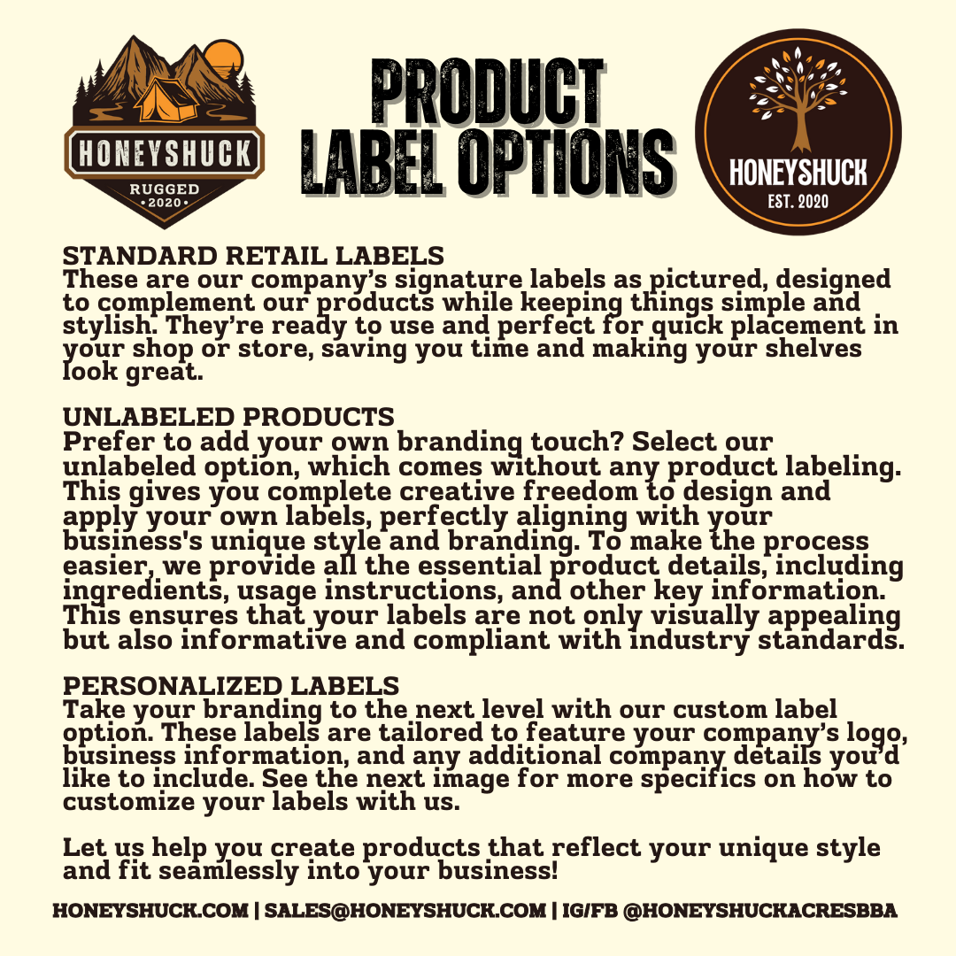Standard Retail Labels: These are our company’s signature labels as pictured, designed to complement our products while keeping things simple and stylish. They’re ready to use and perfect for quick placement in your shop or store, saving you time and making your shelves look great.