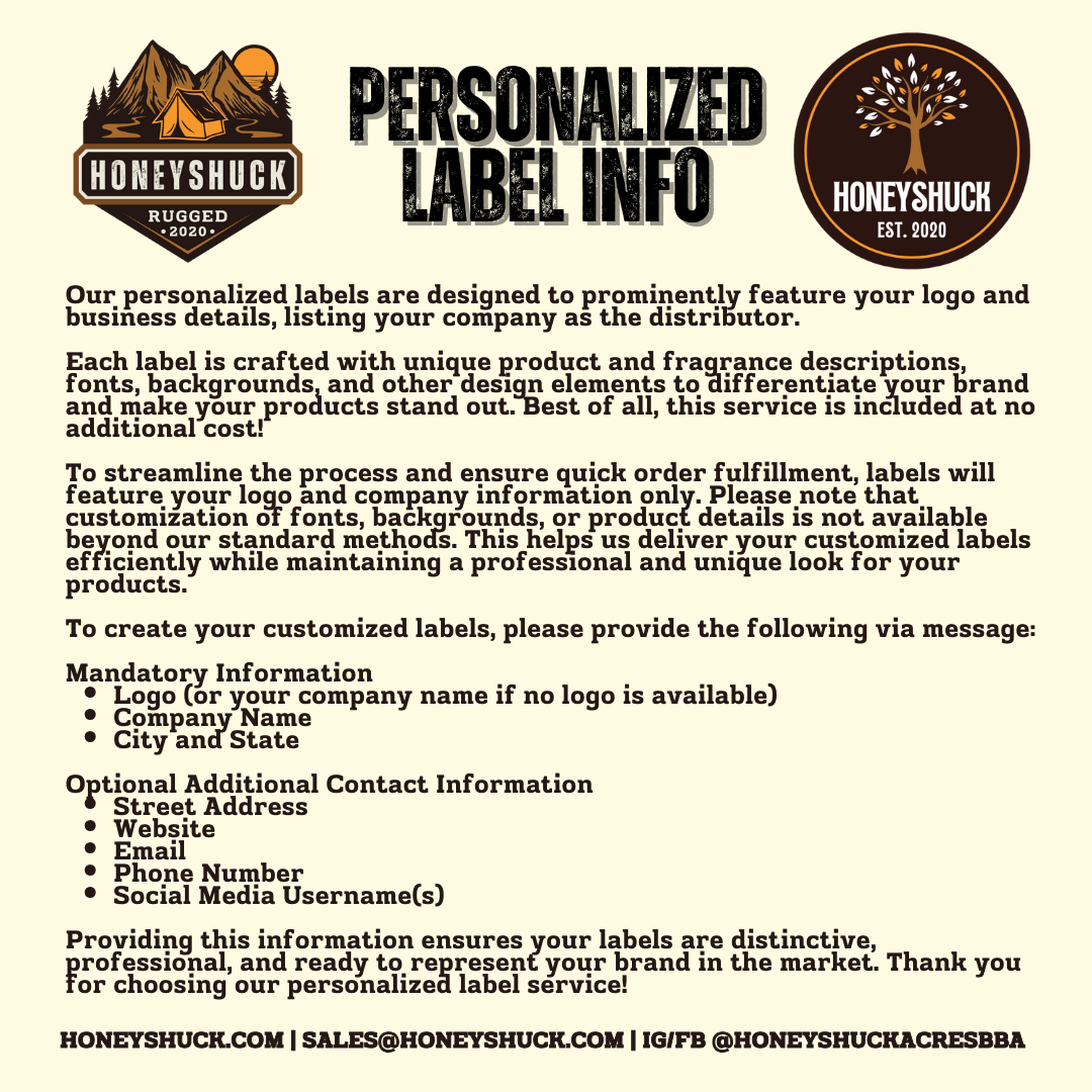 Personalized Labels: Take your branding to the next level with our custom label option. These labels are tailored to feature your company’s logo, business information, and any additional company details you’d like to include. See information below for more specifics on how to customize your labels with us.